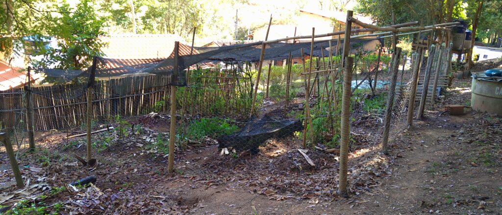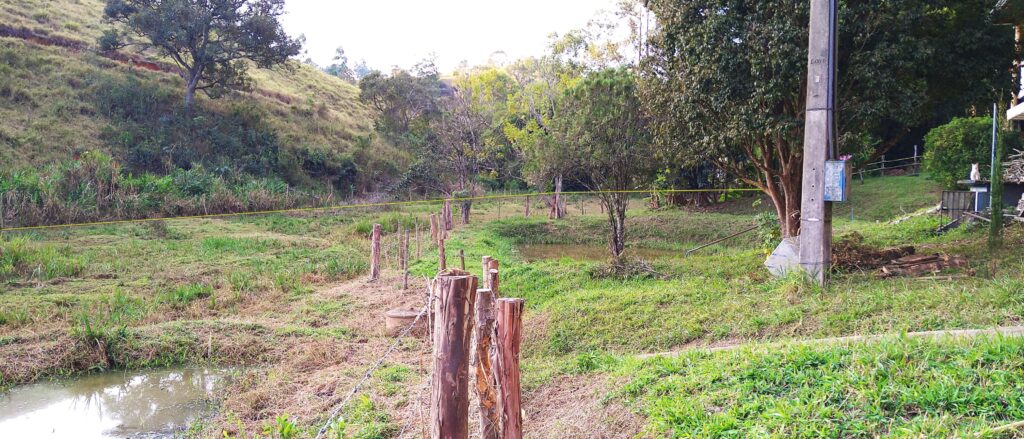 Toda a propriedade é cercada de mourão e arame farpado. Na parte de cima também foi instalado uma tela impedindo a entrada de animais pequenos.